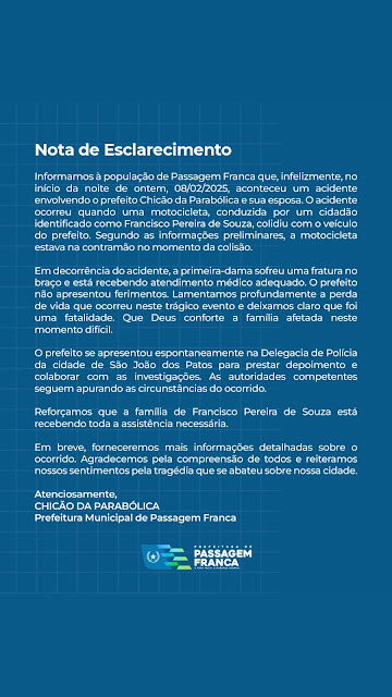 O acidente aconteceu na noite deste sábado (08/02), no município de Passagem Franca /MA, de acordo com informações, o prefeito Chicão da Parabólica, estava dirigindo seu carro, no momento da colisão com uma motocicleta. Ainda segundo informações de testemunhas, o motoqueiro, apareceu de repente na rodovia, o prefeito ainda tentou desviar, mas foi impossível. Infelizmente o motoqueiro Francisco P. de Souza, foi a óbito.